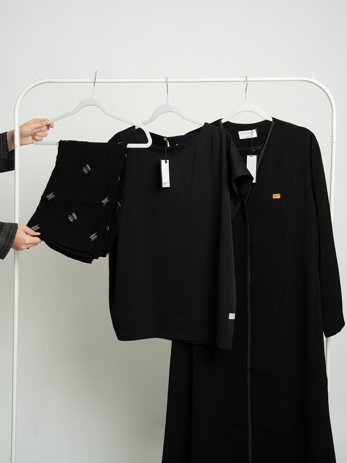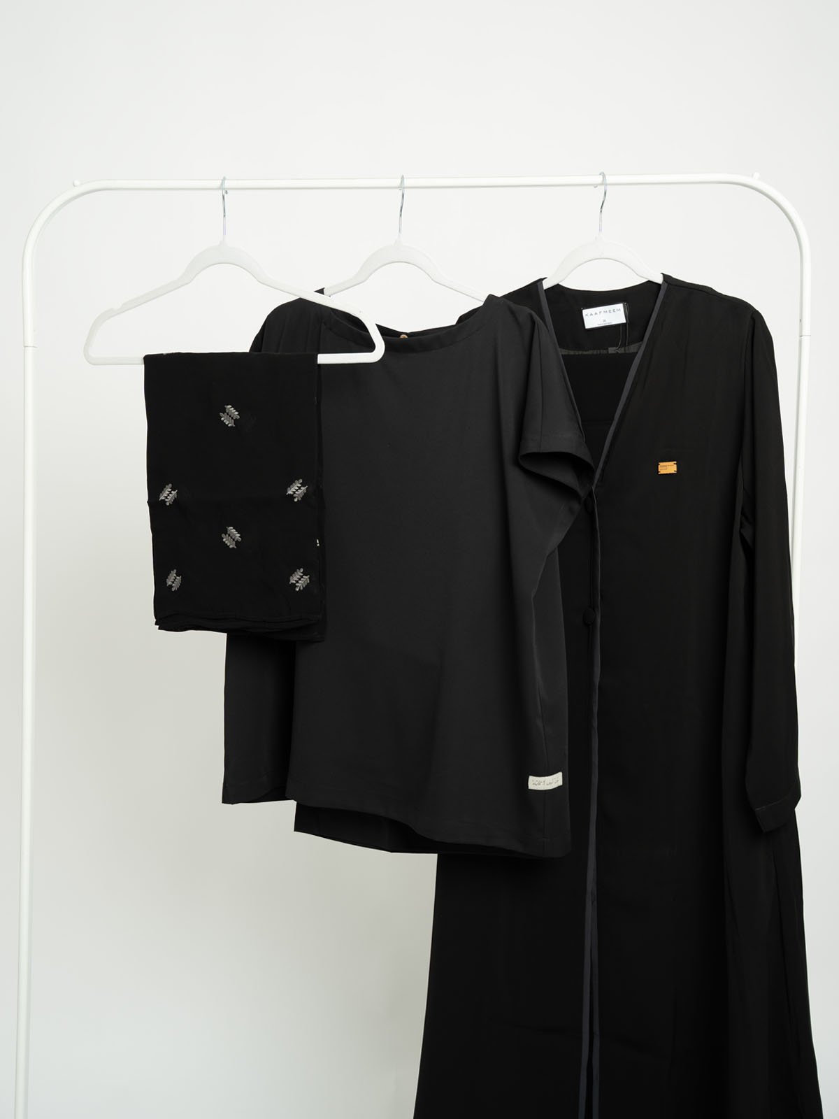 جديد من Abaya House، بكج عملية تجمع بين عباية سوداء تنفيذية، وطرحه سوداء ليزر مطرزة بالسنابل، وطقم خفيف تحت العباية، لتمنحكِ مظهرًا احترافيًا بأقل جهد!