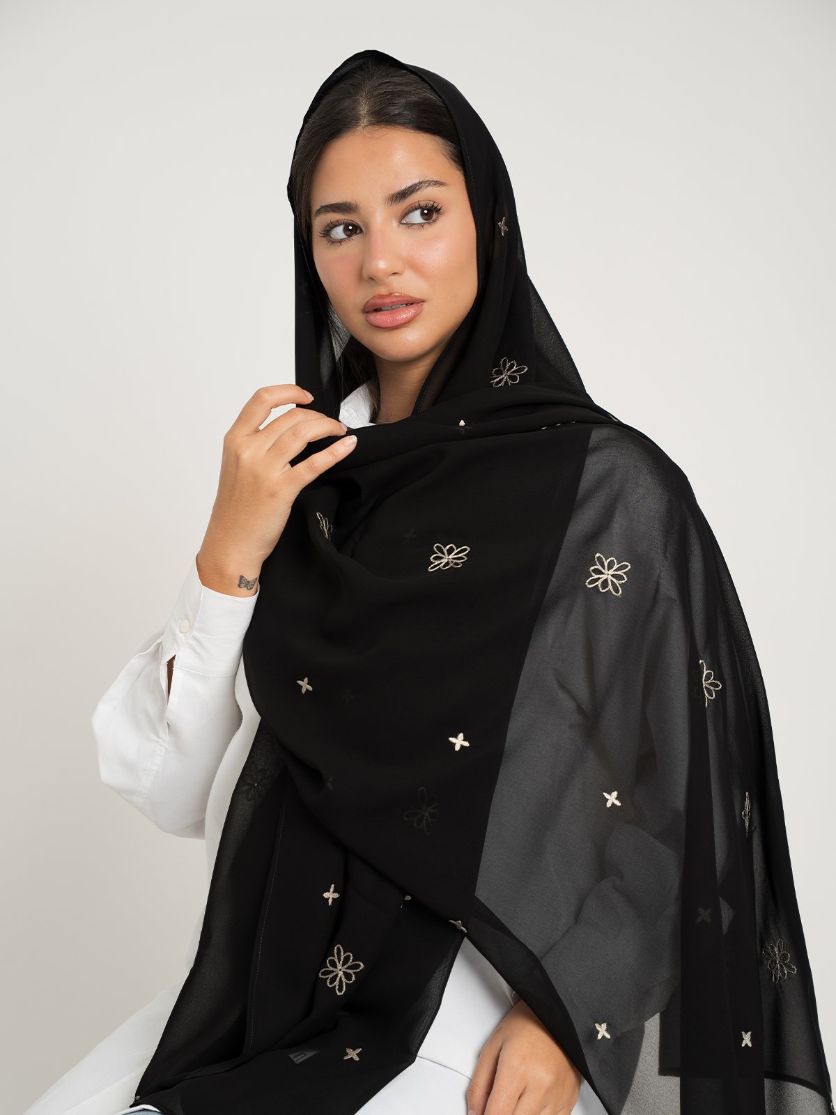 لون الطرحة: طرحه أسود بتطريز بتلات صغيرة.