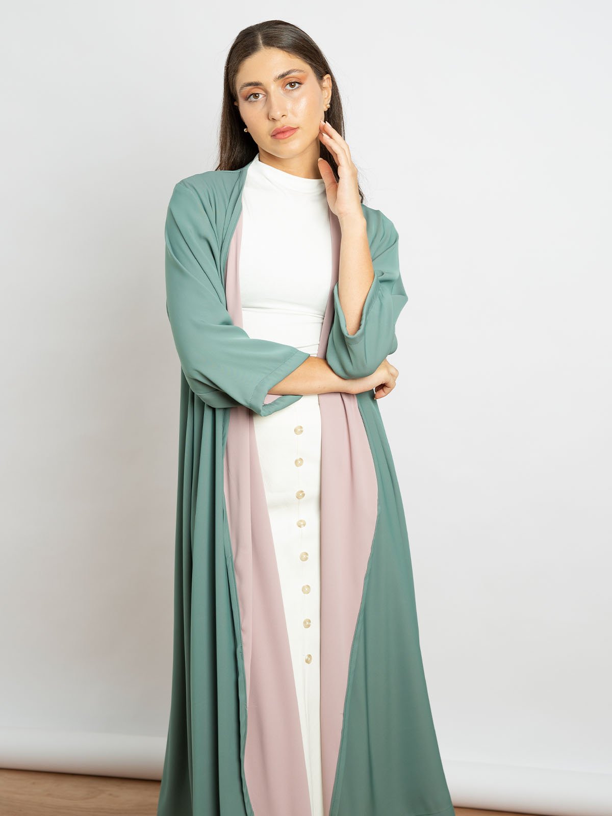 عباية أوربان ميدي مفتوحة بقماش كريب – فستقي مع وردي