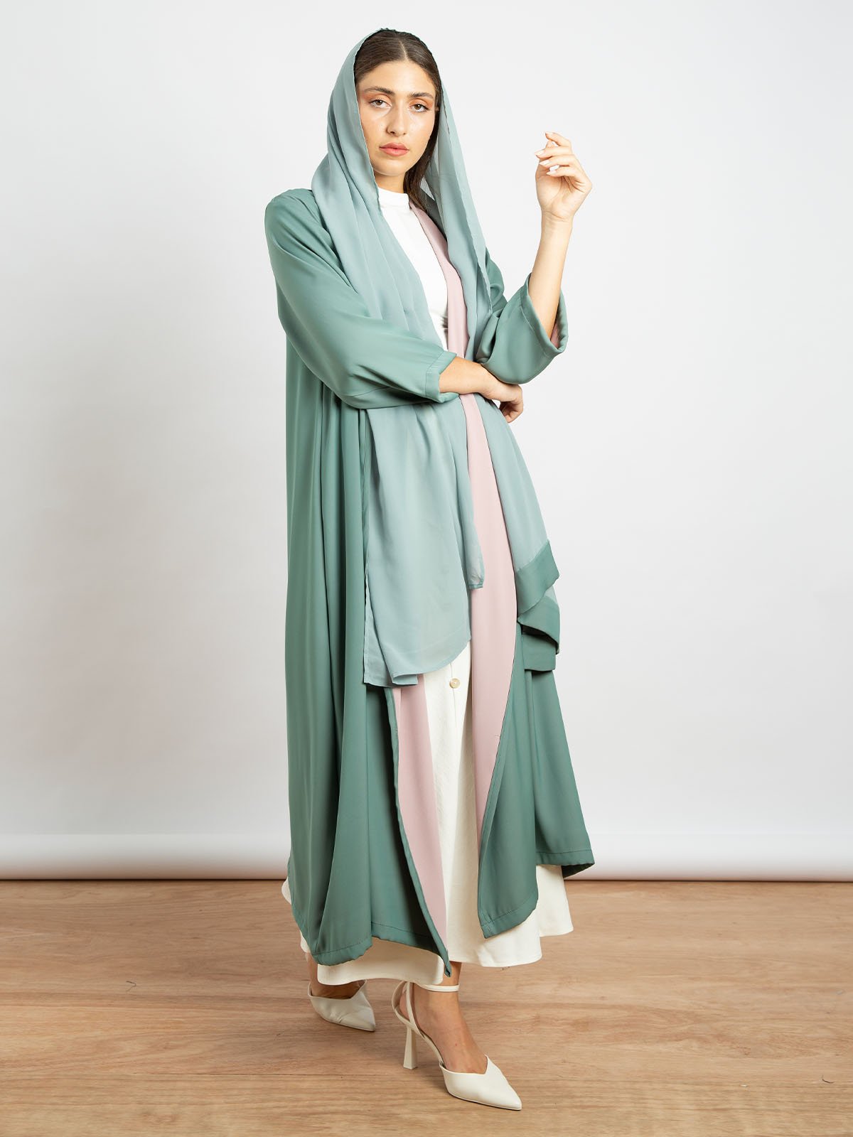 تأتي العباية بلون فستقي مع وردي لإطلالة منعشة.