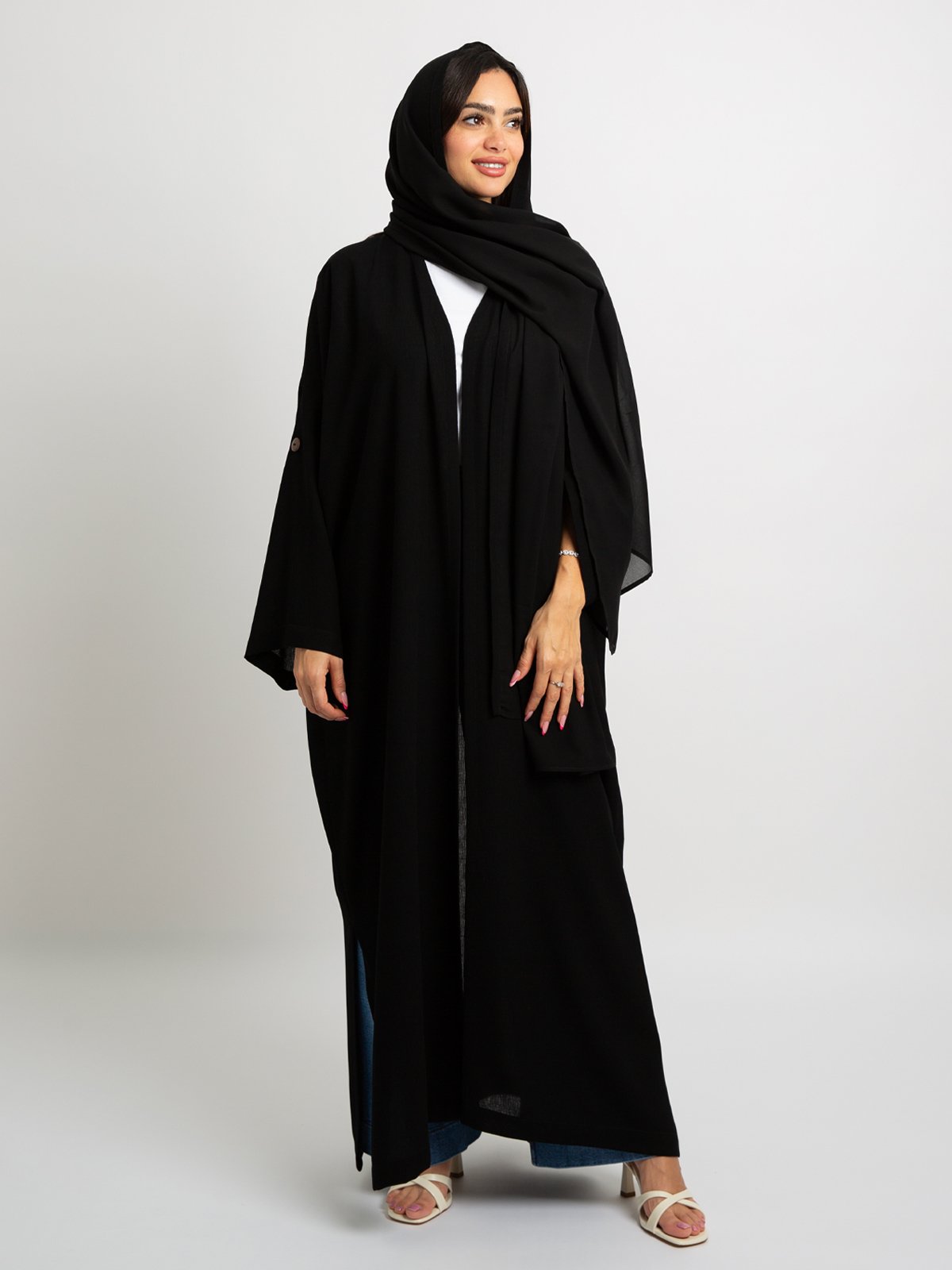 عباية كريب طويلة مفتوحة بقصة بوهيمي واسعة مصنوعة من قماش كريب عالي الجودة بفتحتان على الجانب وأكمام طويلة يمكن ثنيها. عبايتك الكلاسيكية الفريدة لإطلالة ولا أروع. ارتديها في مناسباتك القادمة واخطفي الأنظار بكل أناقة وثقة.