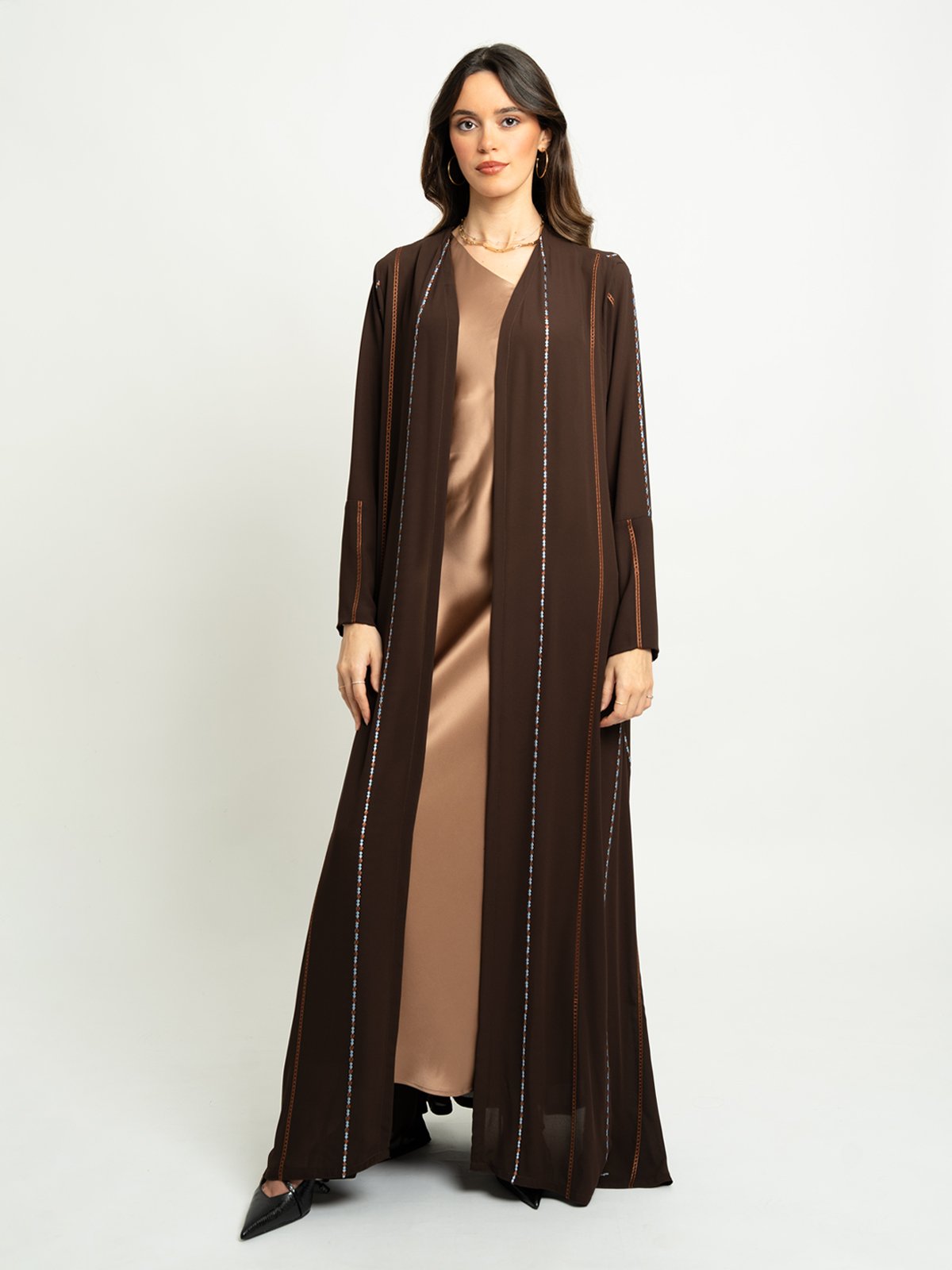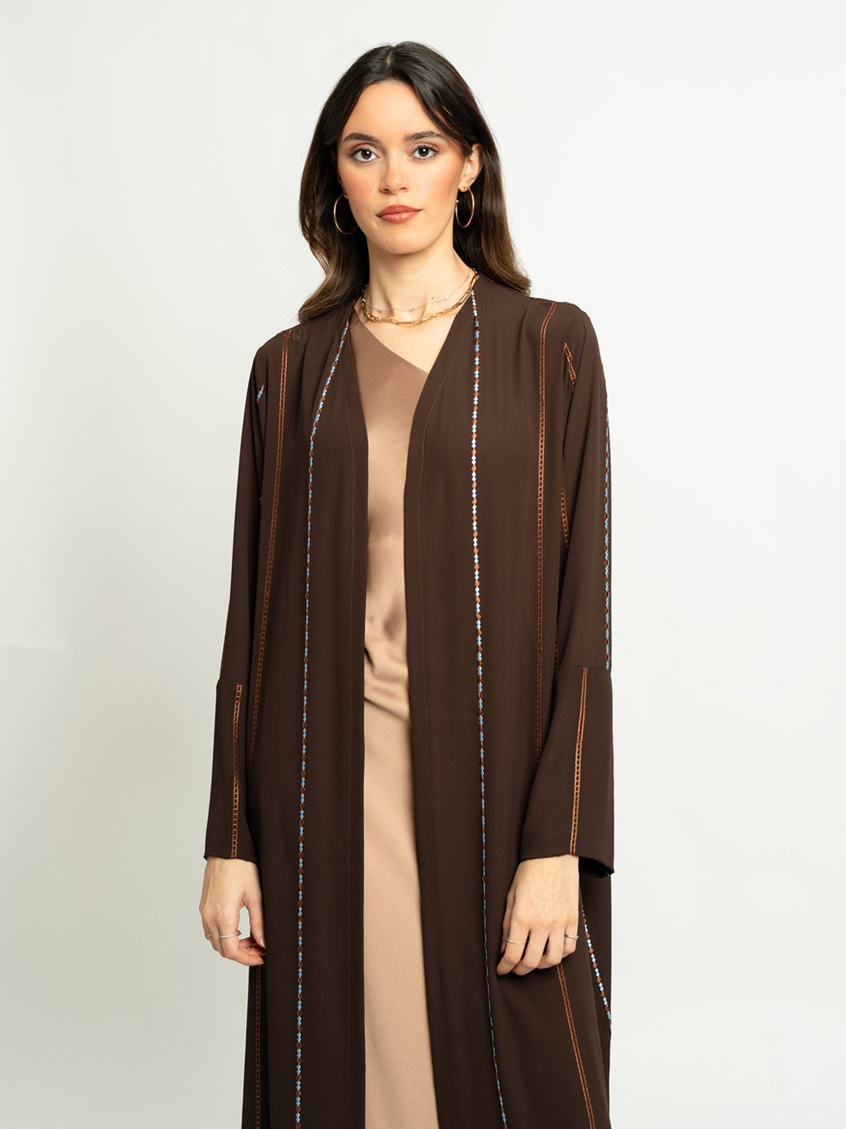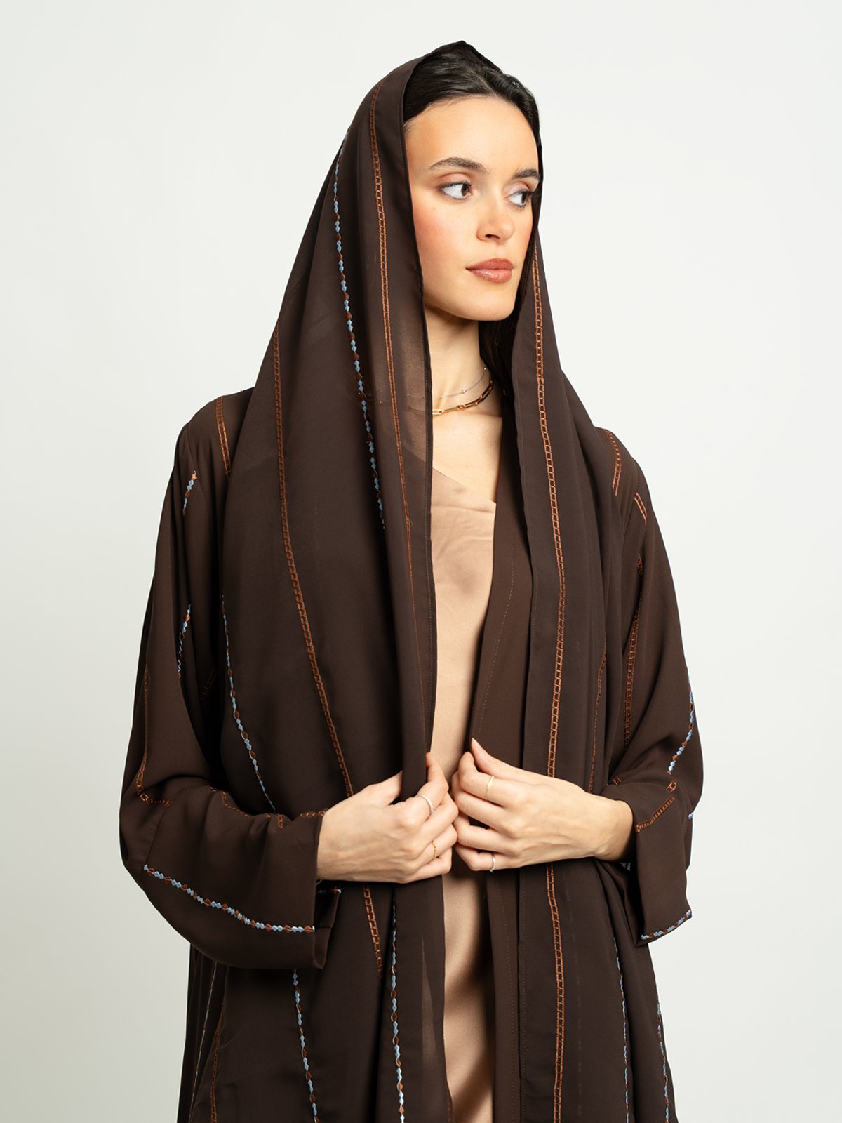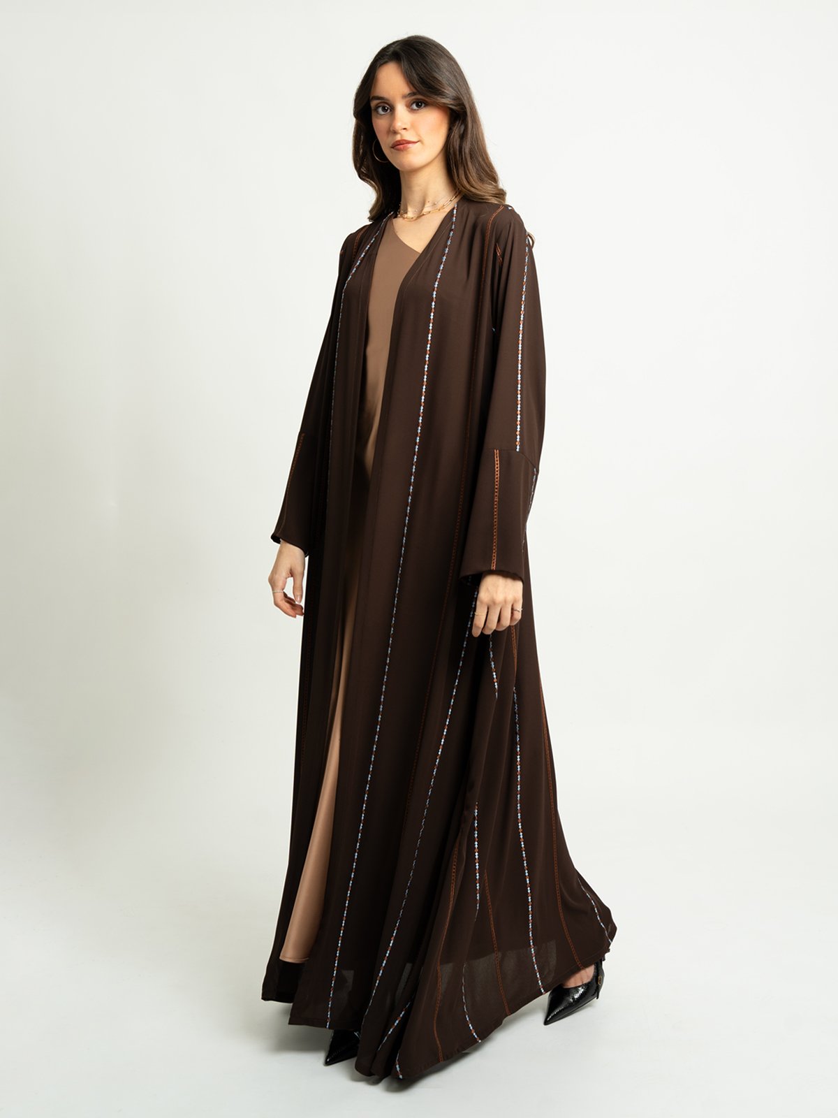 لون العباية: عباية بني داكن بتطريز سلاسل الخطوط.