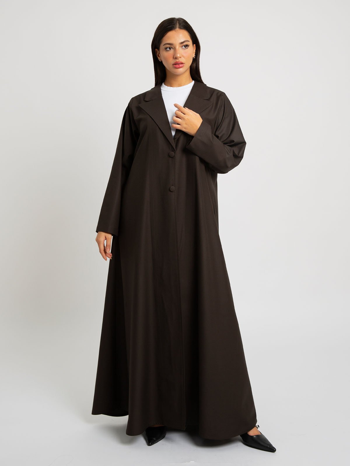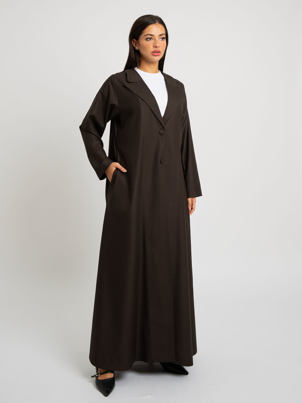 عباية نص كلوش رسمية مصنوعة من قماش بملمس قطني عالي الجودة، بياقة رسمية وأزرار أمامية وجيوب جانبية؛ مصممة بقصة نص كلوش تمنحك إطلالة أنيقة ومميزة!