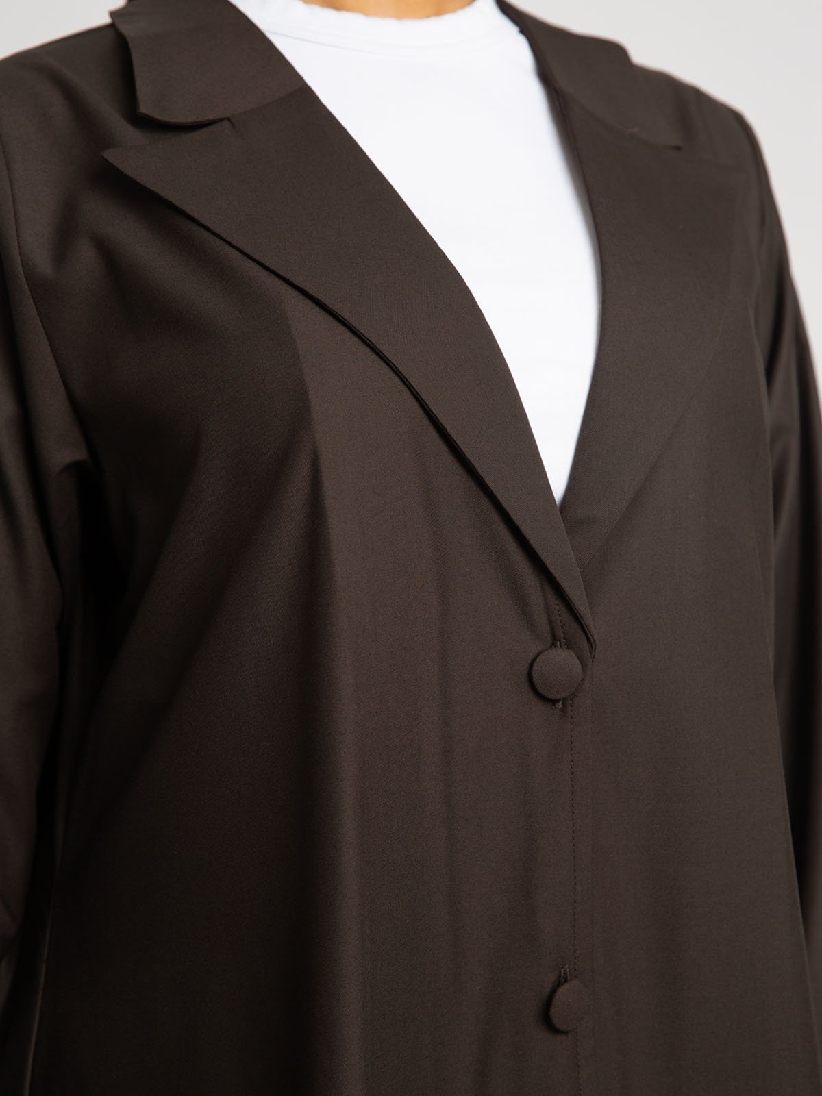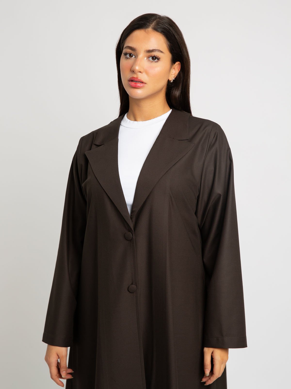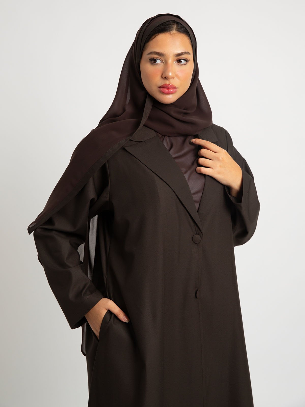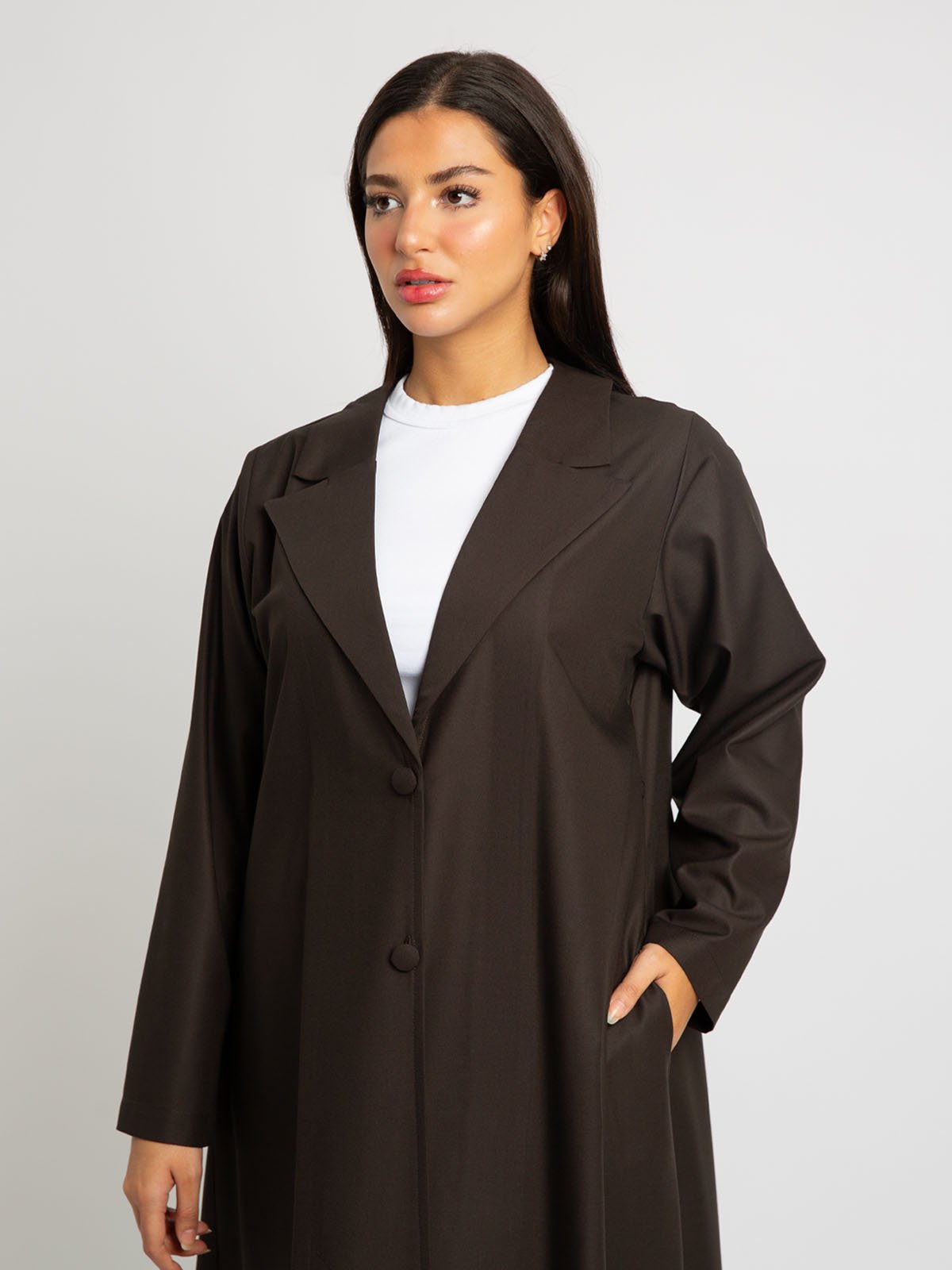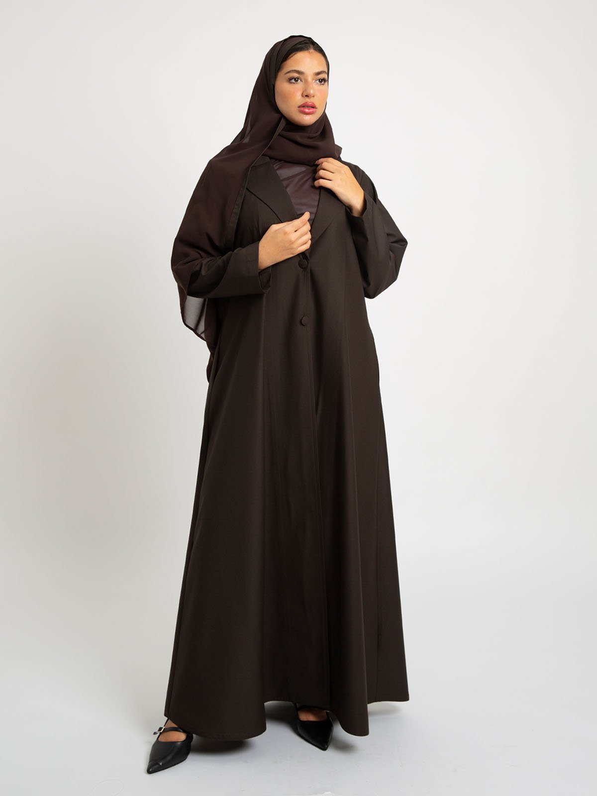 عباية نص كلوش سوت.. لاجتماعات العمل والمناسبات الرسمية!عباية نص كلوش رسمية مصنوعة من قماش بملمس قطني عالي الجودة، بياقة رسمية وأزرار أمامية وجيوب جانبية؛ مصممة بقصة نص كلوش تمنحك إطلالة أنيقة ومميزة!لون العباية:بني.تتميز هذه العباية بـ:قماش بملمس قطني عالي الجودة.أكمام عادية.ياقة رسمية.زران أماميان.جيبان جانبيان.مصممة لتكون أقصر بـ ٢ إنش عن المعتاد، لتمنحك مظهر حيوي وجذاب.قصة A، يمكنك تنسيقها بسهولة.عباية مرتبة وأنيقة، ارتديها في اجتماعات العمل والمناسبات الرسمية.تأتي العباية مع حجاب / طرحه بلون