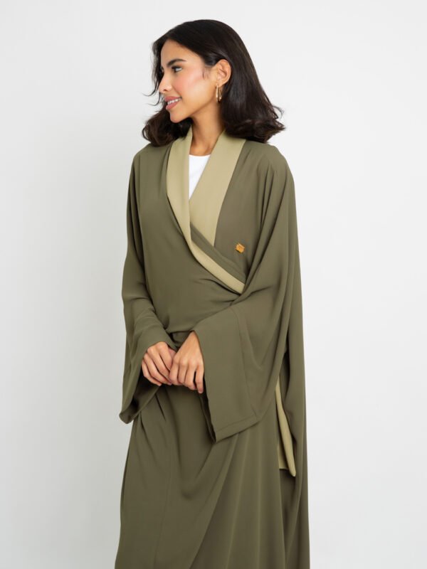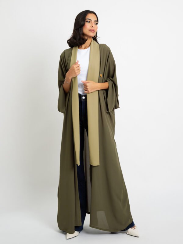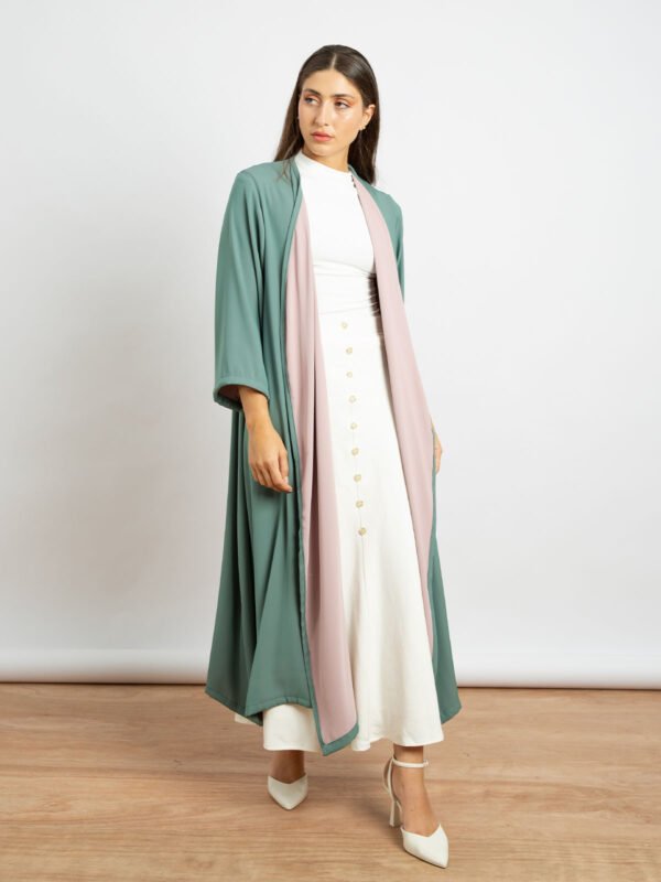 عباية أوربان ميدي مفتوحة بقماش كريب – فستقي مع وردي